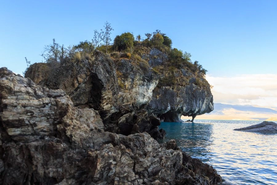 Durante miles de años las aguas del lago General Carrera erosionaron la costa dejando expuesta las formaciones de carbonato de calcio.