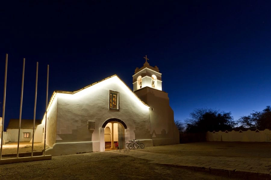 La Iglesia se ubica a un costado de la hermosa plaza de San Pedro de Atacama, donde yacen añosos pimientos.